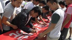 同学们来到现场,都纷纷主动地在印着“采矿工程学院‘诚贷’之声 我心飞翔”签名活动的横幅上签下了自己的名字,这是同学们对诚信的承诺,也是采矿学院对诚信的承诺。