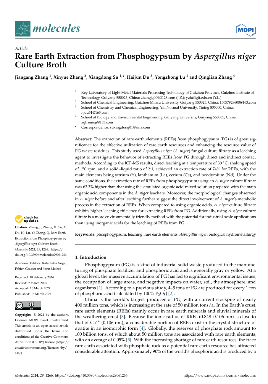 分析测试中心老师张建刚为第一作者,材料与能源工程学院苏向东教授为通讯作者,在国际知名学术期刊《Molecules》(中科院2区,影响因子IF=4.6)上发表题为《Rare Earth Extraction from Phosphogypsum by Aspergillus niger Culture Broth》研究论文,并被中国知网数据库检索。