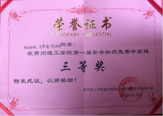 为全面普及同学们的安全知识,强化校园安全文化教育,大力营造校园安全文化氛围,在“4▪18”校庆之时,yabo鸭脖官网举办了“yabo鸭脖官网第一届安全知识竞赛”,化学工程学院青年志愿者协会的杨柳枝、陈沛雨和毛厚娟三位同学组成化学工程学院代表队参加比赛。