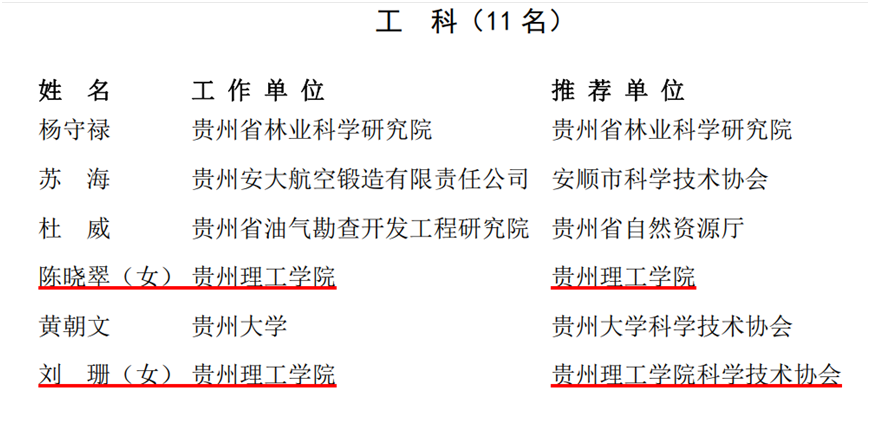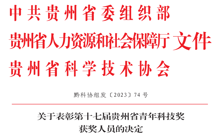 本网讯(科技处)近日,中共贵州省委组织部、贵州省人力资源和社会保障厅、贵州省科学技术协会发布《关于表彰第十七届贵州省青年科技奖获奖人员的决定》(黔科协组发〔2023〕74号),yabo鸭脖资源与环境工程学院陈晓翠、材料与能源工程学院刘珊、食品药品制造工程学院卢永仲三位教师荣获第十七届贵州省青年科技奖。