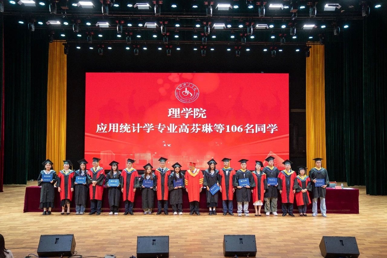在学士学位授予仪式上,毕业生身着学士服依次走向主席台,接受校学位委员会扶正流苏、授予学位并合影留念。