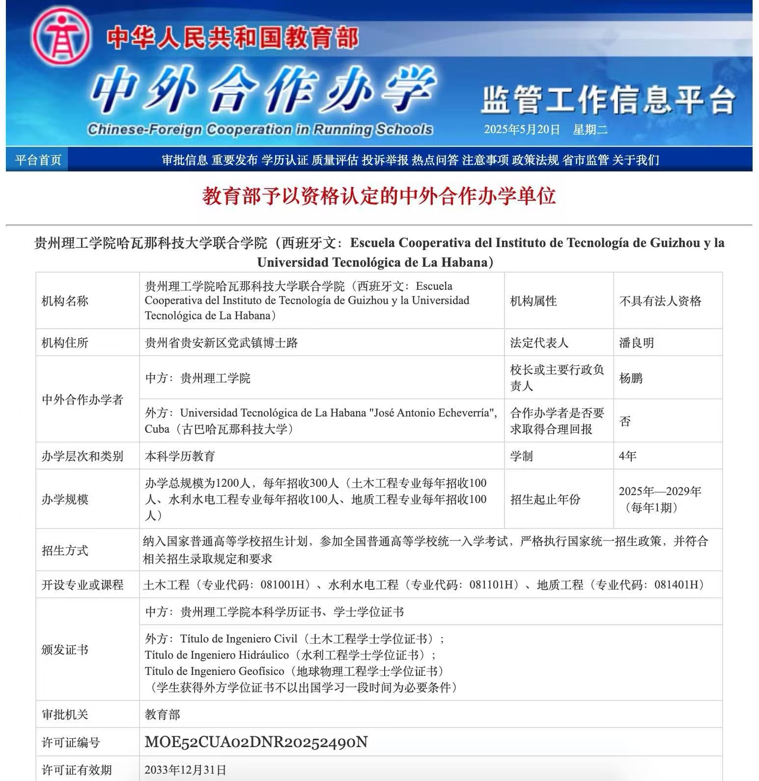 近日,教育部中外合作办学监管工作信息平台传来重磅喜讯:yabo鸭脖官网与古巴哈瓦那科技大学合作设立的yabo鸭脖官网哈瓦那科技大学联合学院正式通过教育部资格认定,成为学校首个获教育部批准成立的中外合作办学机构,是中拉首批工程类合作办学机构,也是全国为数不多用西班牙语授课的工程类中外合作办学机构,为中拉文明互鉴与科技教育融合开辟了全新路径。