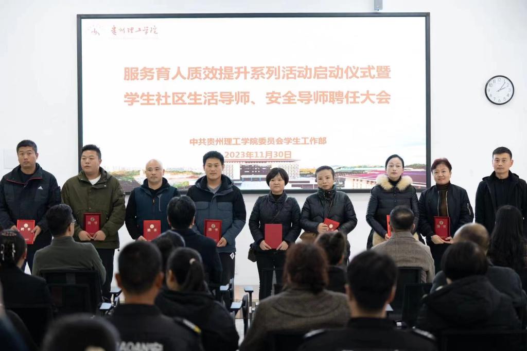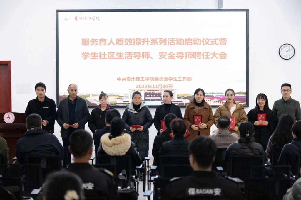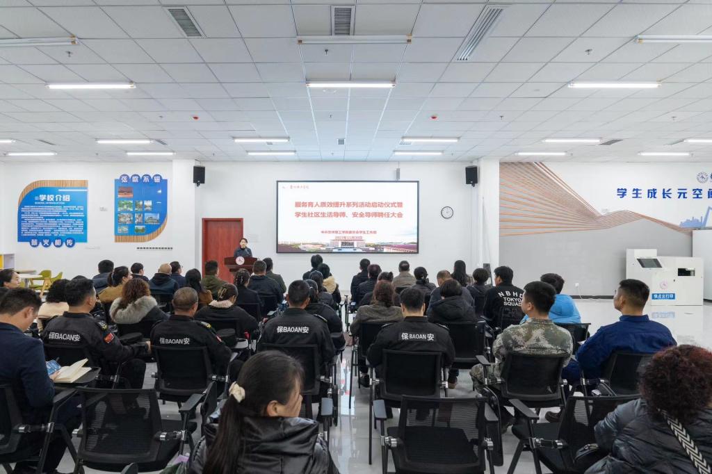 本网讯(学生工作部 杜安定)为深入推进学校“一站式”学生社区综合管理模式建设,持续有效提升服务育人成效,更好地将“三全育人”工作落细落实,11月30日下午,yabo鸭脖官网服务育人质效提升系列活动启动仪式暨学生社区生活导师安全导师聘任大会在蕴华楼学生综合服务大厅召开。校党委书记苏向东、党委副书记高勇出席会议。校党委宣传部、学生工作部、保卫工作部、后勤管理处、科技园等相关部门负责同志,物业公司管理人员、宿管、保安以及服务商代表现场参会。