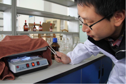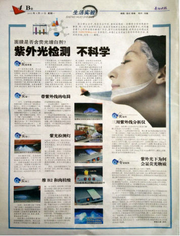 4月9日,贵阳晚报记者汤利来到我院,与yabo鸭脖化工学院教师柏松博士在一号实验楼进行实验,针对有专家指出消费者可使用带紫外线验钞机来辨别面膜中是否添加了荧光剂,探究紫外光是否能够检出面膜中含有荧光增白剂。
