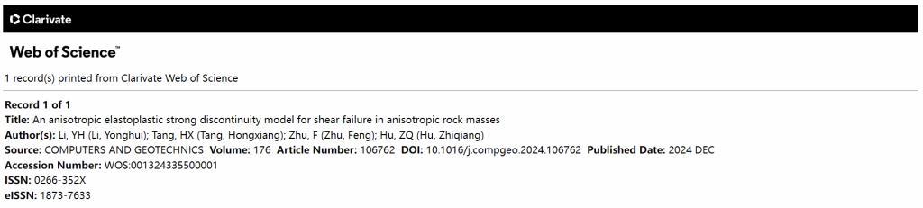 日前,yabo鸭脖官网土木工程学院李永辉老师以第一作者身份在国际权威期刊《COMPUTERS AND GEOTECHNICS》(TOP期刊,中科院一区,影响因子IF=5.3)上发表题为《An anisotropic elastoplastic strong discontinuity model for shear failure inanisotropic rock masses》研究论文,并被Web of Science数据库检索。