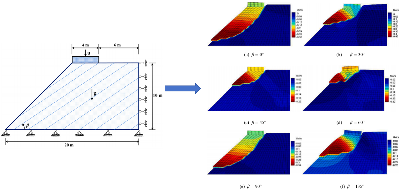 通过两个数值示例,即各向异性岩体的单轴压缩试验和各向异性岩质边坡的加载问题,展示了各向异性弹塑性SD-FEM模型在分析各向异性岩体力学特性方面的显著优势。该模型不仅能反映岩体的各向异性力学特性,还能准确模拟岩体从均匀变形到滑移破坏的完整渐进破坏过程。值得注意的是,滑移量(即不连续位移)随着施加荷载的增加呈线性增长,突显了岩体的弹-脆性变形特性。此外,即使在软化阶段,全局刚度矩阵的特征值仍然保持正值,这使得数值计算可以继续进行,并确保了网格无关的数值解,这表明各向异性SD-FEM可以在应变软化发生时正则化边值问题的不适定性,解决了经典FEM数值计算中网格依赖的问题。